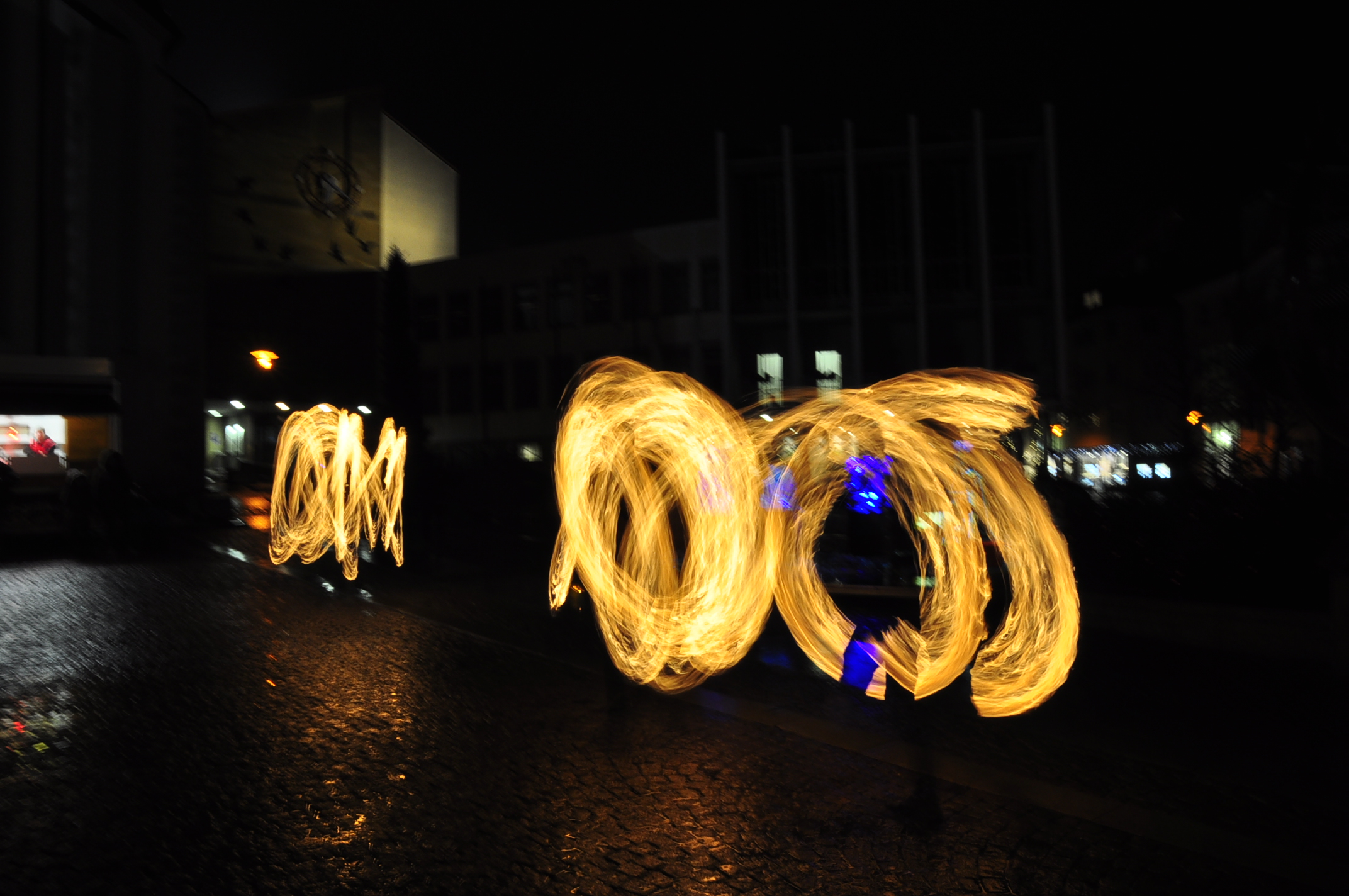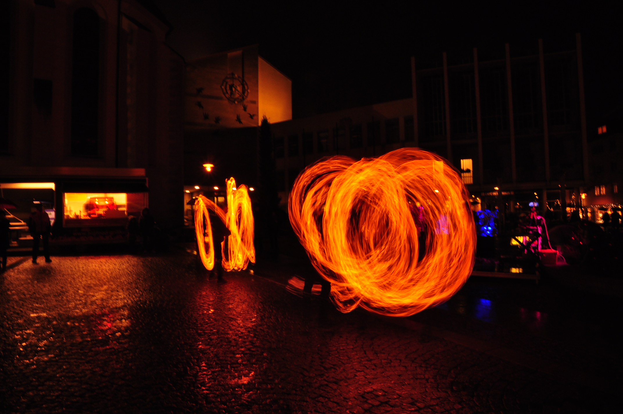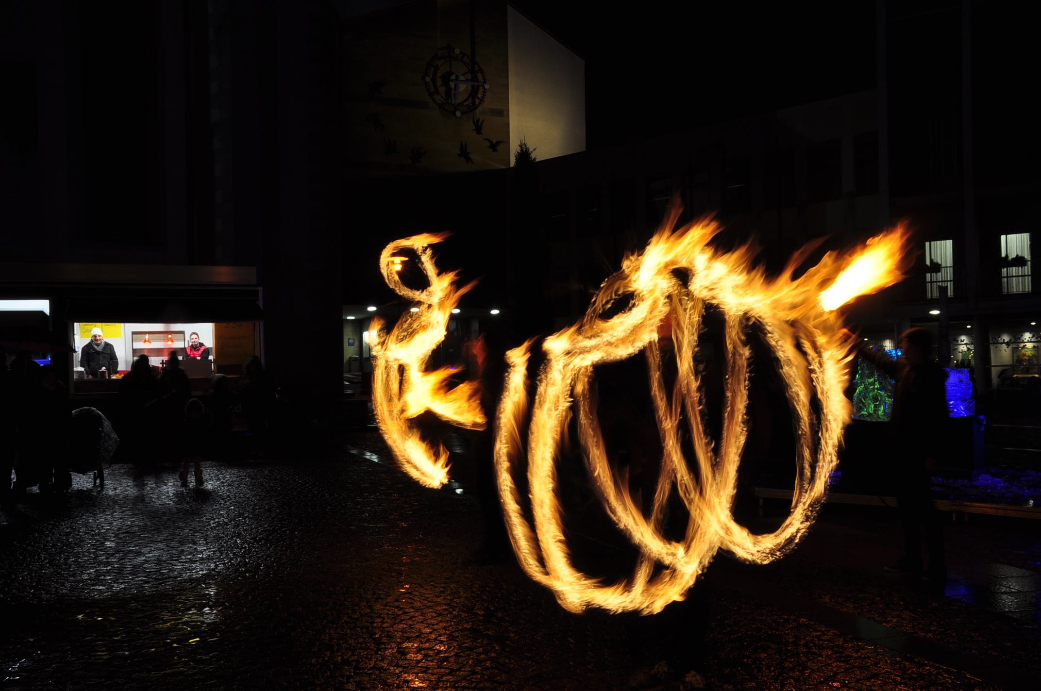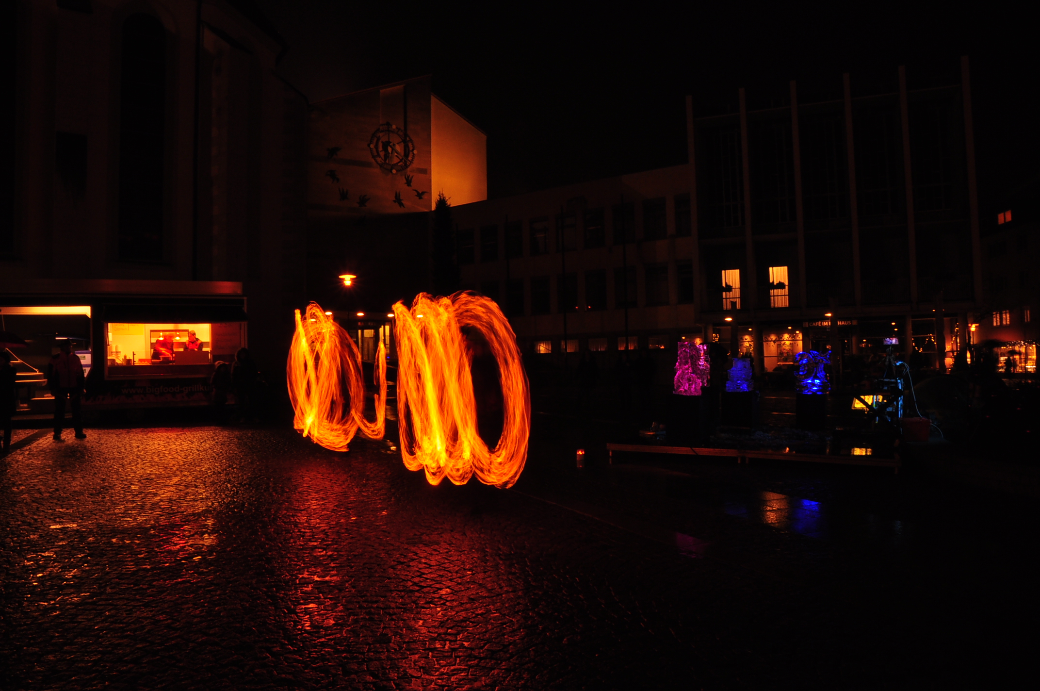 Feuer und Eis... auf dem Adenauerplatz in Friedrichshafen. Ein "Spiel" der Elemente. Die ZirkusAkademie "umspielt" den Eiskünstler.