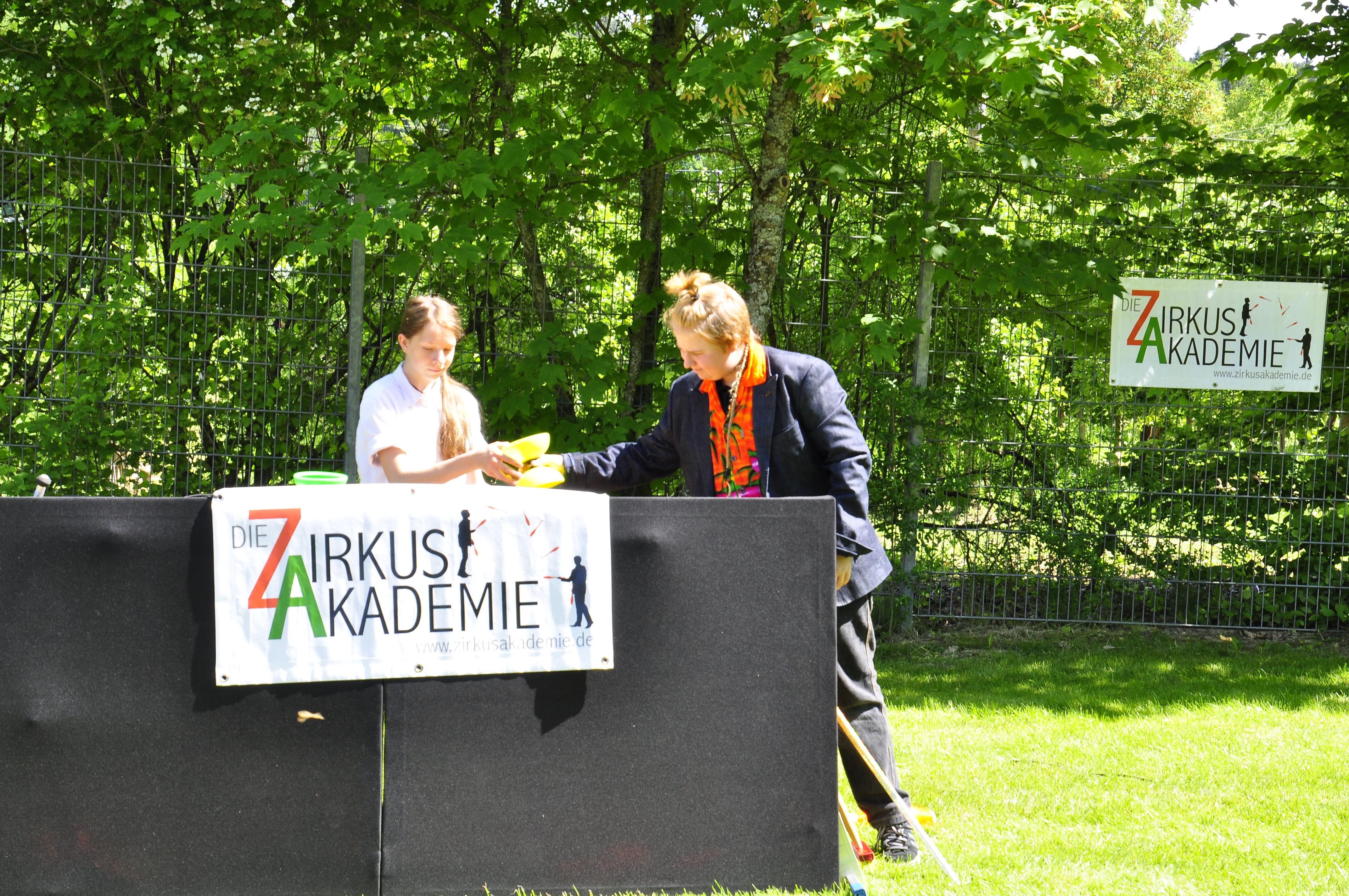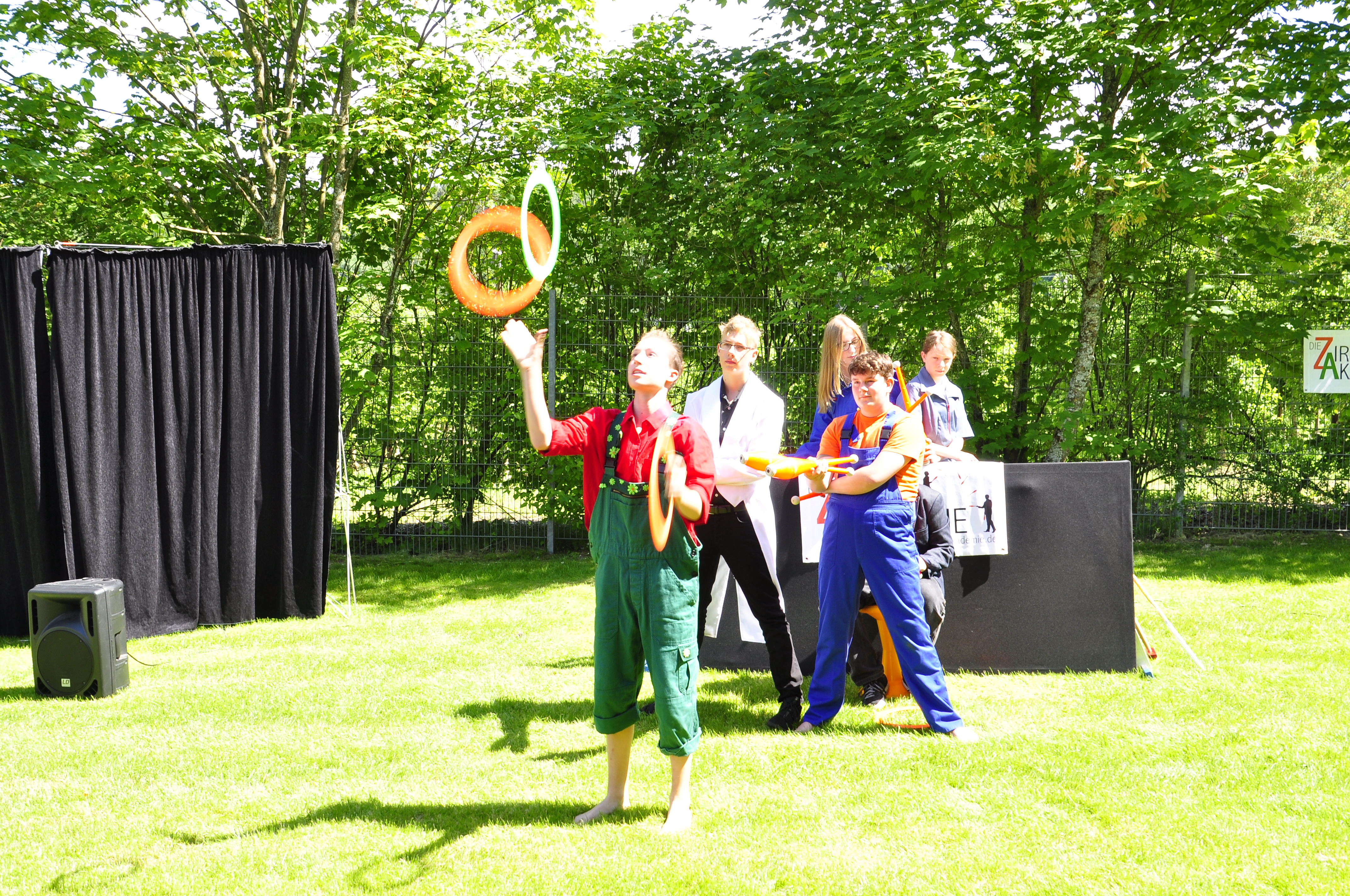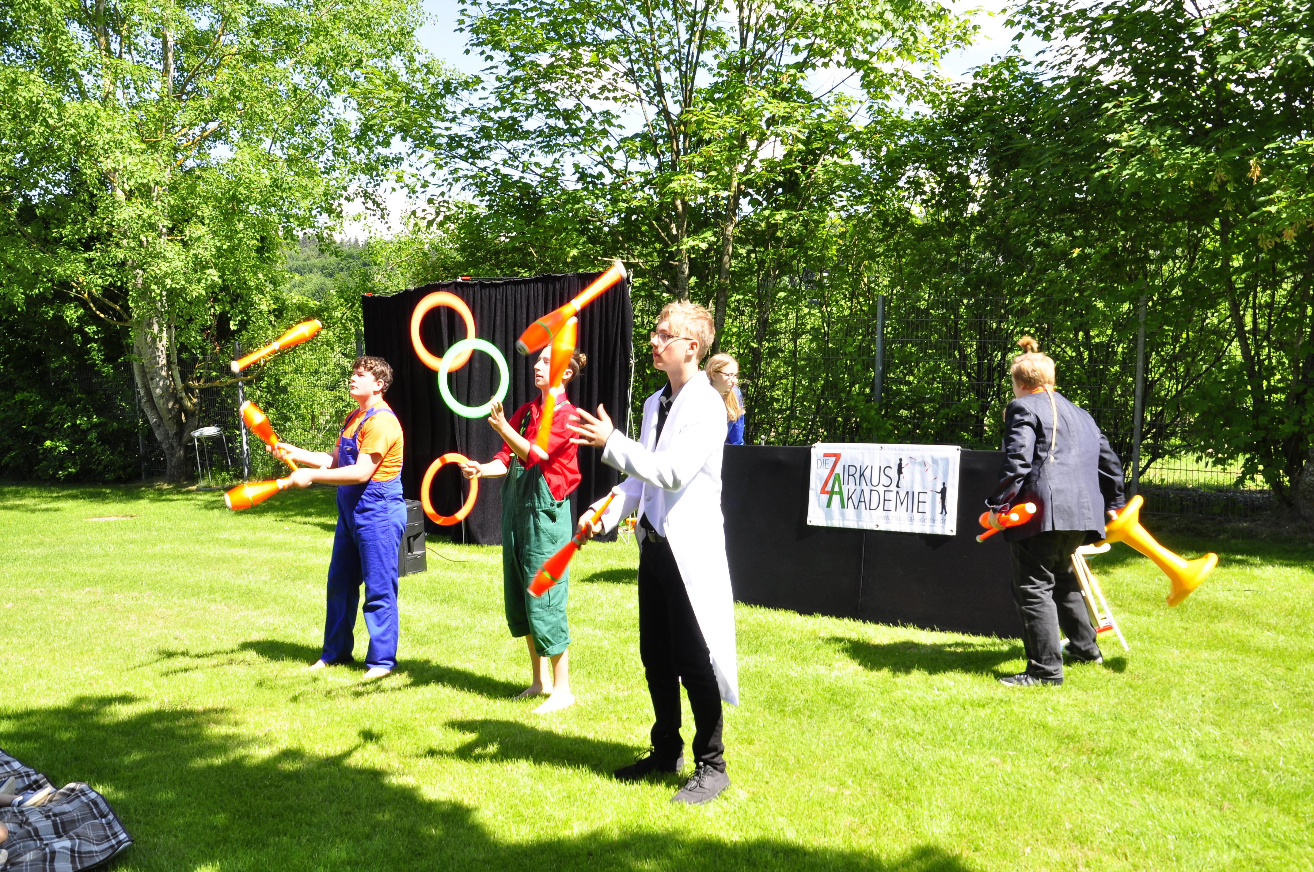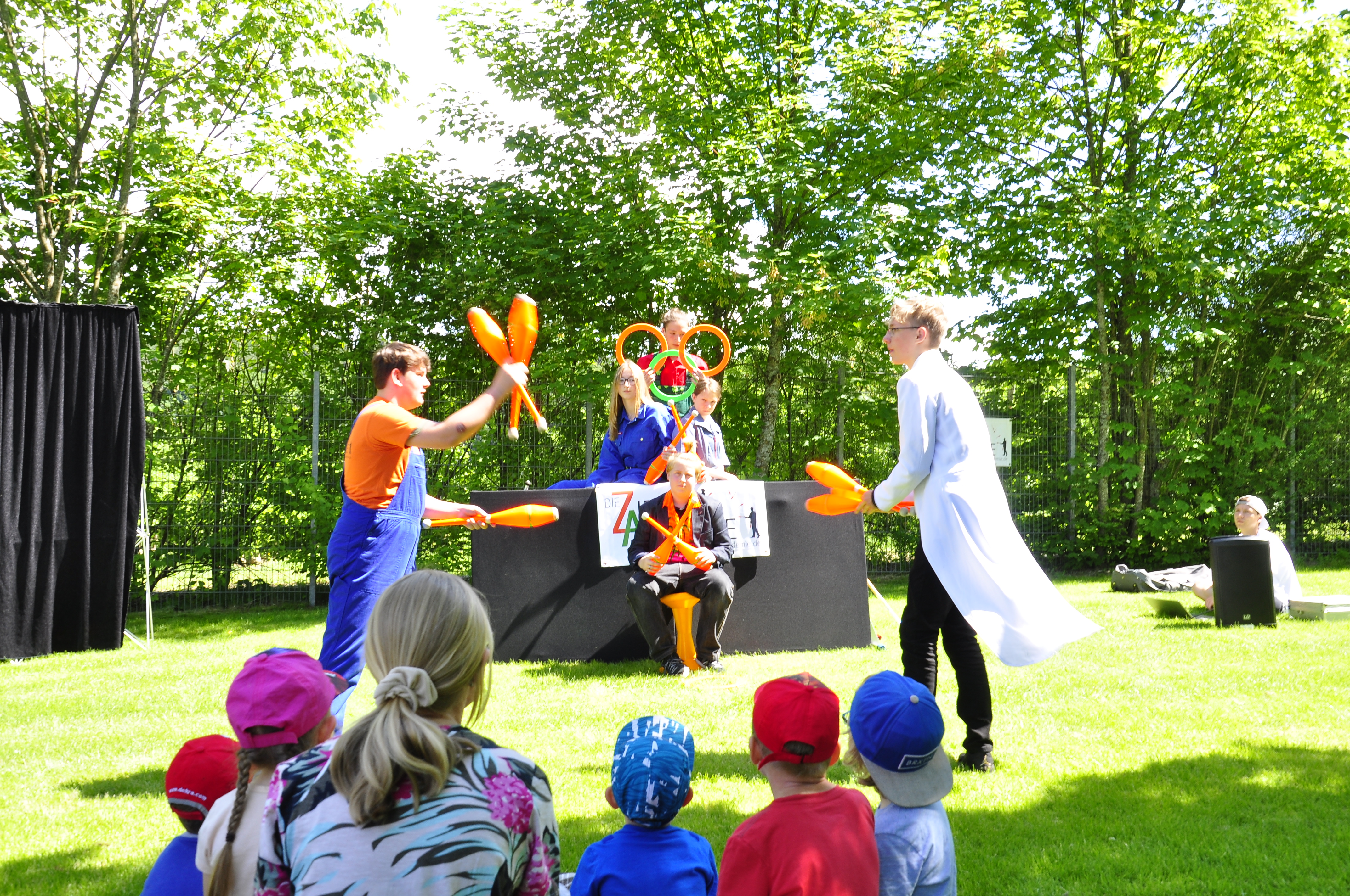 Die Zirkus-Tour-Gruppe im Bädle in Obereisenbach. Eine Vorstellung für den VauDe Kindergarten und Besucher.
